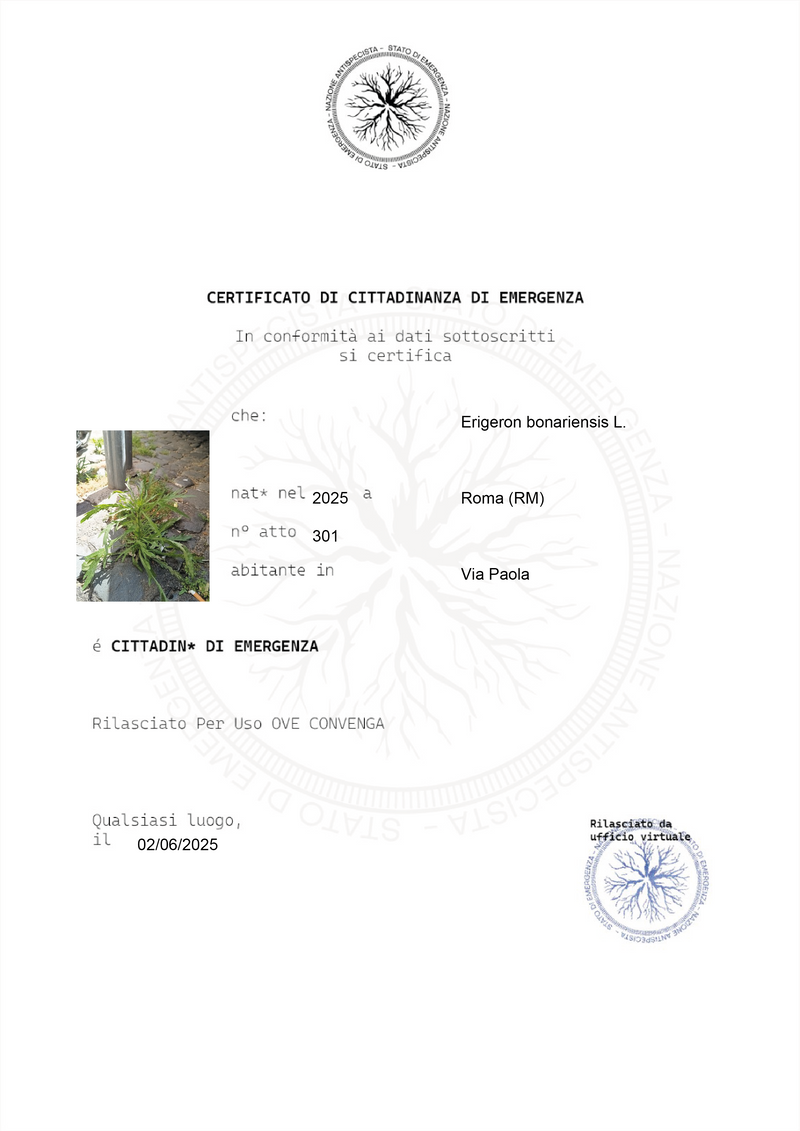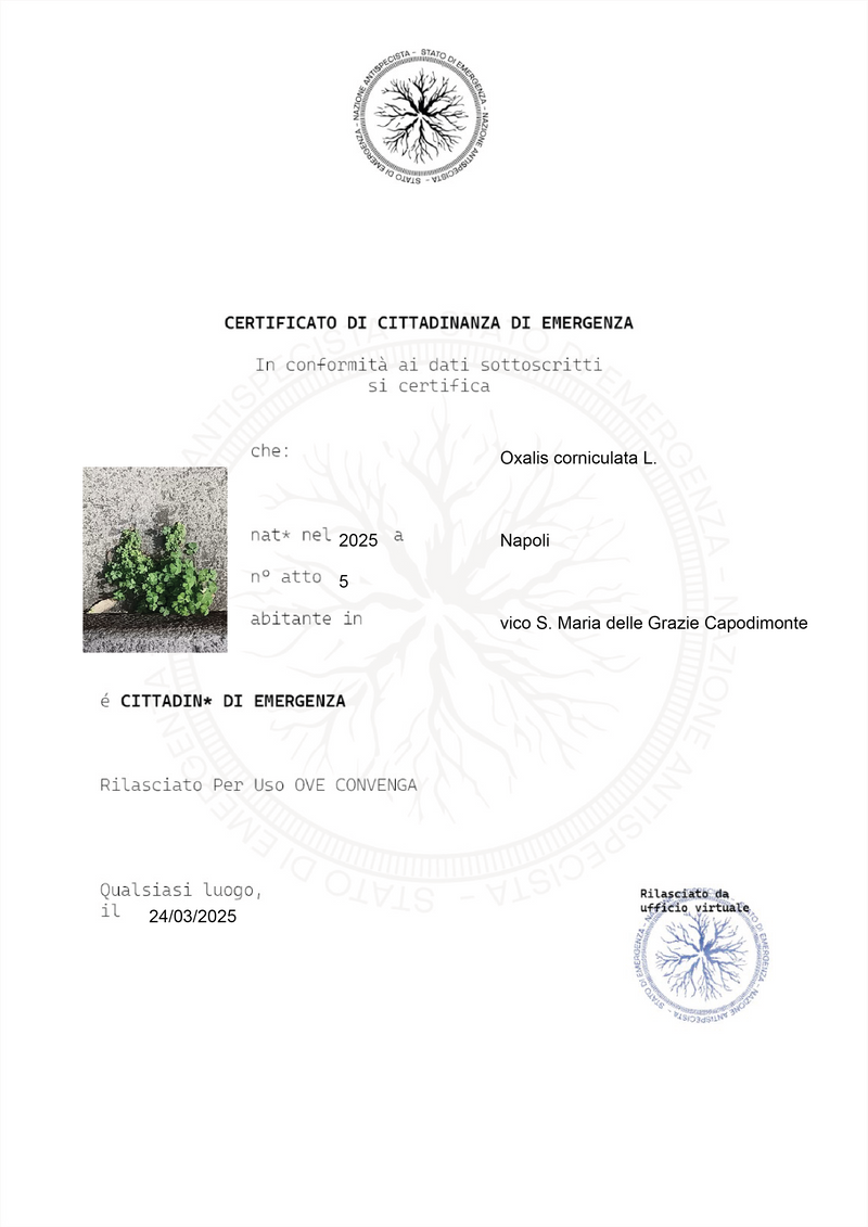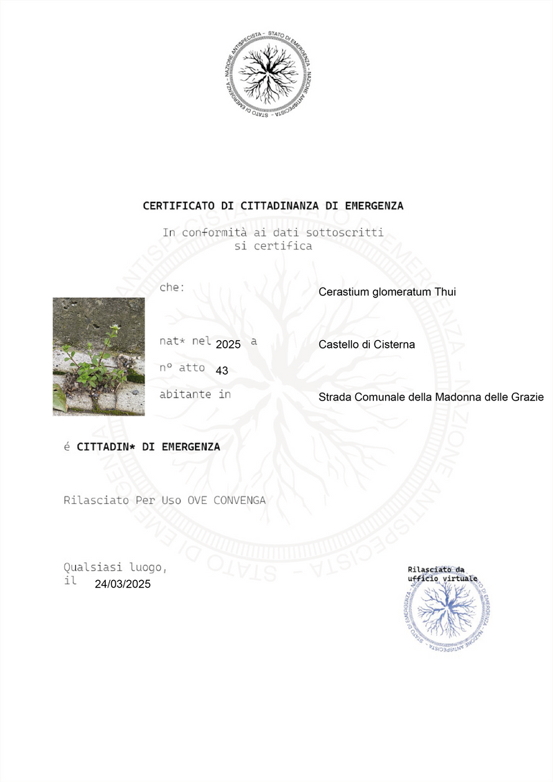*Future Forward Feature "Stato di emergenza (State of Emergency) steers its inquiry toward a multispecies perspective, acknowledging the agency of living beings beyond the human. The project dismantles an anthropocentric paradigm grounded in market utility, proposing instead a view of life as intrinsically valuable—useful, yet not reducible to a mere economic resource or aesthetic instrument.The research and encounters with spontaneous plants thus become a practice for building multispecies relationships, and an imaginative device to envision a “nation” on a horizontal plane, where all species coexist on equal terms.Visit the nation at this link: https://www.raimondocoppola.com/stato-emergenza/"